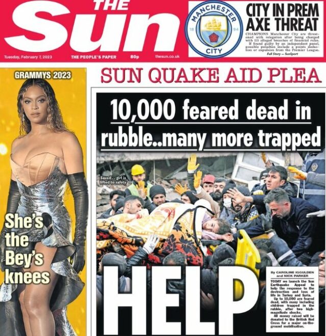 "Onlara yardım edin" manşetiyle çıkan Sun gazetesi, 10 bin kişinin enkaz altında ölmüş olmasından korkulduğunu yazarken depremzedeler için bir yardım kampanyası da başlattığını duyurdu.