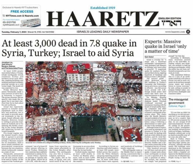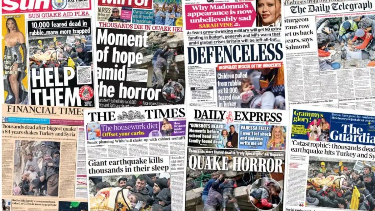 Times gazetesinin manşetinde "Dev deprem binlerce kişiyi uykusunda öldürdü" denildi.