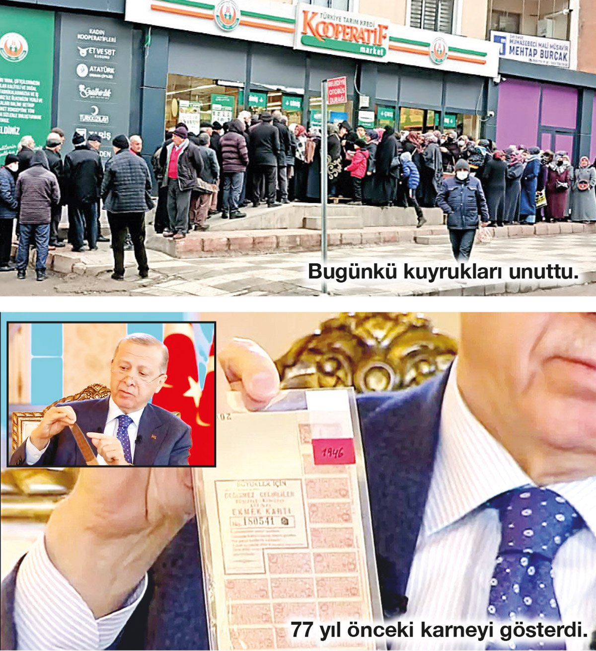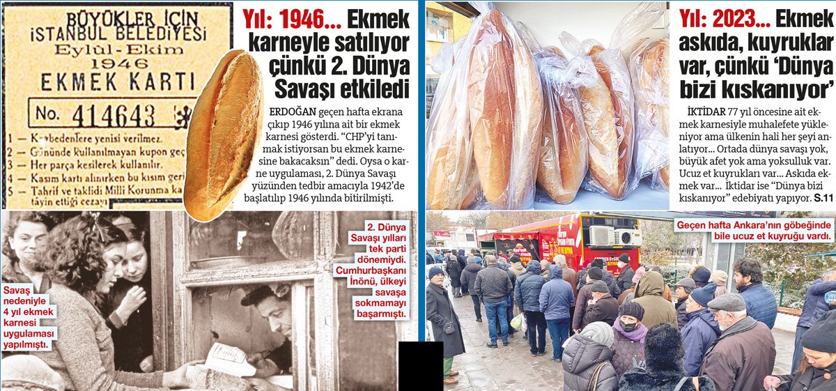 - Geçenlerde bir yayında eline 1946 tarihli olduğu belirtilen bir ekmek karnesi alıp sallıyor. Türkiye o yıllarda kaybedeceği savaşa girmemek için elinden geleni yaptı, ancak tedbir olarak büyük bir orduyu hazır tuttu. Yaklaşık 1 milyon kişilik ordunun hazır tutulması, yetişkin erkeklerin askere alınması hem iş gücünde ciddi düşüşe hem de tarım üretiminde yüzde 50’ye yakın düşüşe yol açtı. Karne bu koşullarda ortaya çıktı. İsmet Paşa’ya bir çocuk, ‘Bizi ekmeksiz bıraktın’ der, İsmet Paşa da ‘Ben sizi ekmeksiz bıraktım ama babasız bırakmadım’ der. Daha sen bunu anlayamamışsın çıkmışsın elinde karne