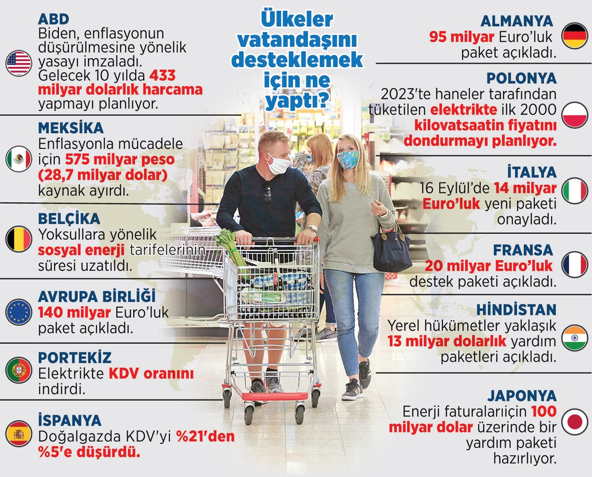 Bu kapsamda ABD, “Enflasyonu Düşürme Yasası” ile gelecek 10 yılda 433 milyar dolarlık harcama yapılmasını planladı. Avrupa Birliği de (AB) 140 milyar Euro’luk harcama ile tüketicilerin artan yaşam maliyetlerine destek sağlayacak. AB üye ülkeleri bunun yanında özel tedbirler de almaya başladı. Fransa’da emekli maaşları ve sosyal yardımları artırmayı ve kira artışlarını askıya almayı amaçlayan 20 milyar Euro’luk yasa çıkarıldı. İtalya’nın, 14 milyar Euro’luk paket hazırladığı enflasyon mücadelesinde Almanya da vatandaşlarına yardımcı olmak için 30 milyar Euro’luk iki yardım paketinin ardından 65 milyar Euro’luk bir paket daha açıkladı. İngiltere, 1 Ekim’den itibaren hane halkının enerji faturalarının yıllık en fazla 2 bin 500 sterlin olacak şekilde iki yıl boyunca sabit tutacak. Belçika’da ise vatandaşlara ısınma için 225 Euro, elektrik için 100 Euro’luk katkı sağlandı.