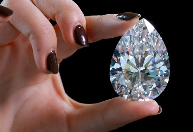 Yaklaşık bir golf topu büyüklüğündeki eşsiz ve armut biçimli elmasın 228.31 karat olduğu açıklandı. The rock yani kaya ismi verilen elmasın yaklaşık 30 milyon dolar gibi bir fiyattan alıcı bulması bekleniyor.