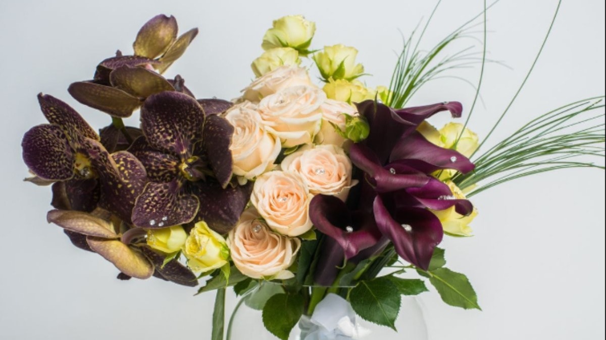 Khalilov’un tasarımı, nadir bulunan çiçeklerden oluşuyor. Bukette ‘Wedding Invite’ ve ‘Sofie’ türü sprey güller, koyu mor Calla (kalla) zambakları, çikolata kahverengisi Vanda orkidesi bir araya getirildi.