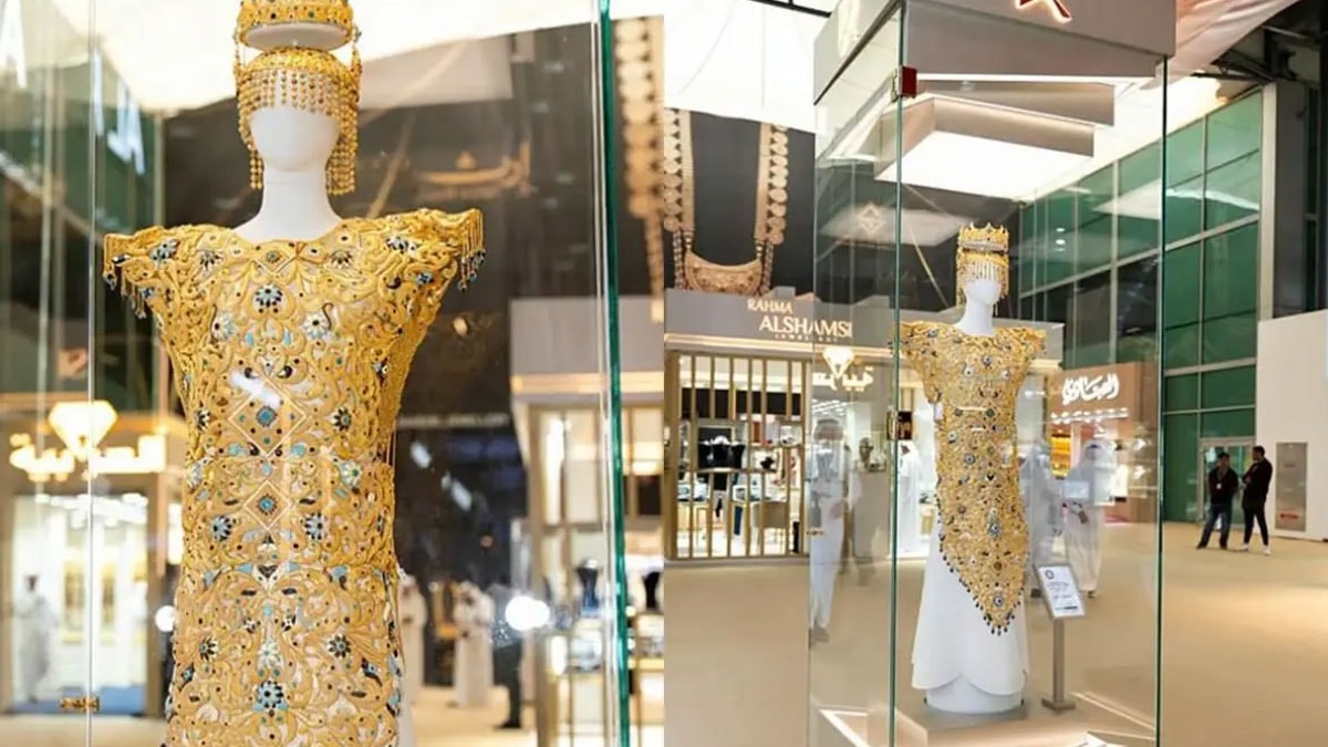 BAE'de sergilenen altın elbise, 27 Eylül'den bu yana Sharjah Expo Centre'da görülebiliyor. 10.08 kilogram ağırlığında ve tamamı 21 ayar altından üretilen elbisenin yanında 398 gramlık bir altın taç, 134.1 gramlık küpeler ve 738.5 gramlık "Hiyar" adlı süs de bulunuyor.