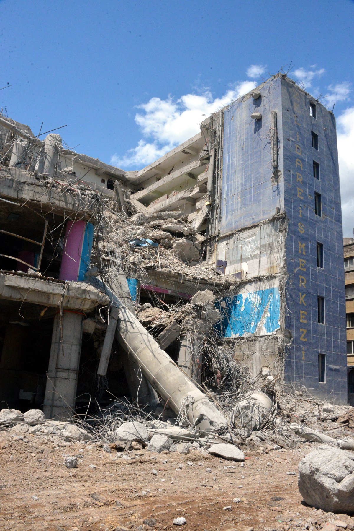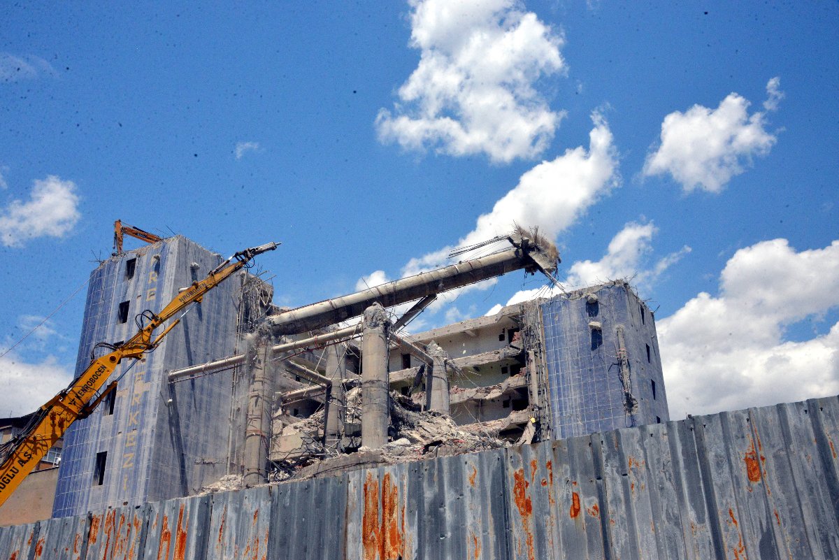 Kentin en işlek caddesi olan Trabzon Bulvarı'ndaki bina tıraşlama tekniğiyle yıkılıyor. Büyük vinçlerle en tepeye çıkarılan iş makineleri tüm katları tek tek yıkarak aşağı iniyor. Binanın her biri 45 metre uzunluğundaki 8 büyük kolon da yıkıldı. İlgili firma son kolonunun yıkılmasıyla birlikte kurban kesti.
