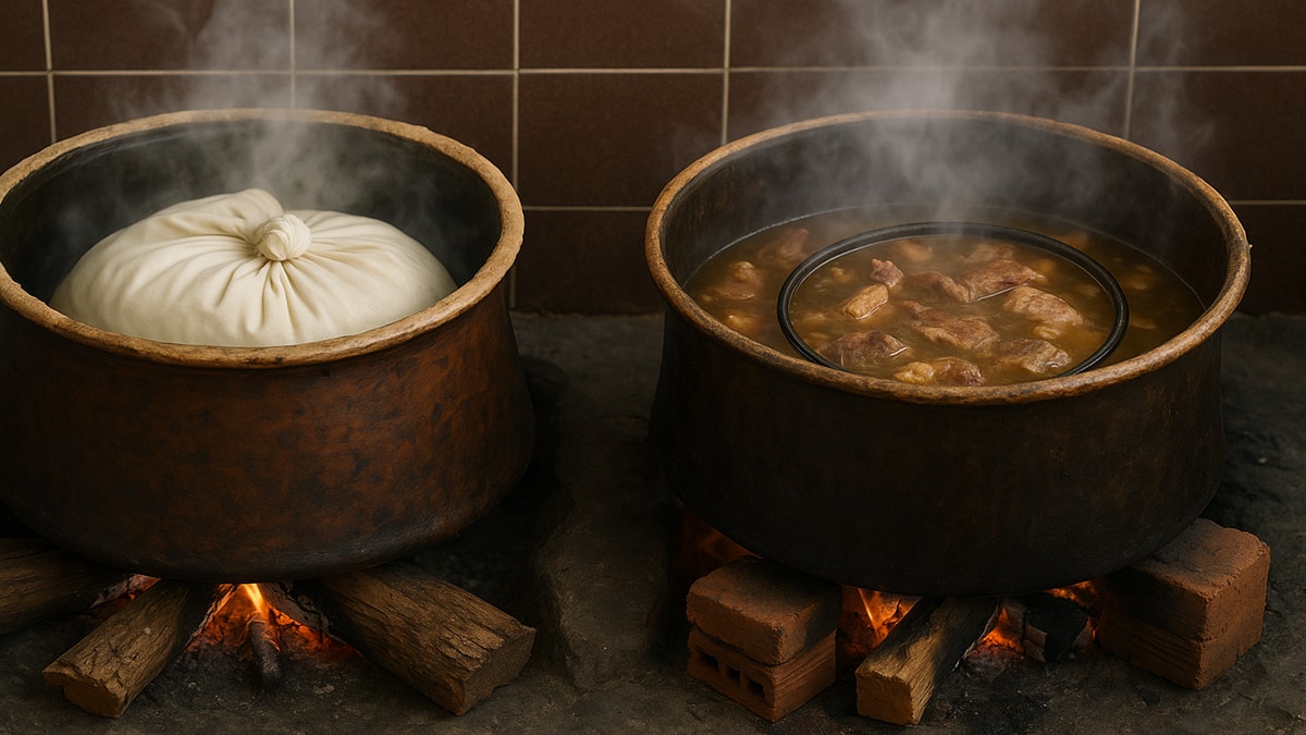 Büyük bakır kazanların içine et ve pirinç kat kat yerleştiriliyor. Katmanların arasına özel baharatlar ekleniyor. Üzeri lahana veya üzüm yapraklarıyla kapatılıyor. Odun ateşinde, çok kısık ısıda 16–18 saat boyunca pişiriliyor.