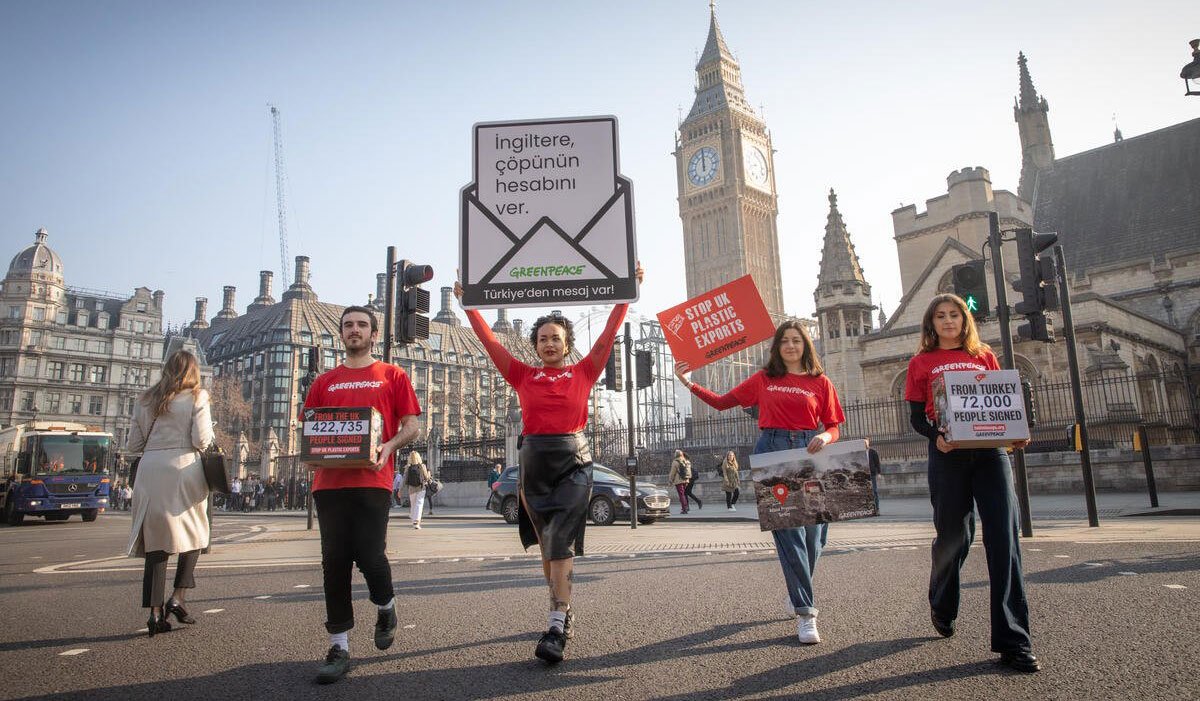 “İngiltere çöpünün hesabını ver” Greenpeace üyeleri, plastik atık gönderiminin yasaklanması için Türkiye’den toplanan 76 bin imzayı İngiltere’de Başbakanlık Ofisi’ne teslim etti.PLASTİK KİRLİLİĞİ ULUSLARARASI SUÇ