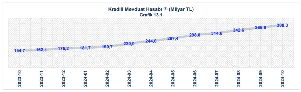 Kredili mevduat hesabı yani halk arasında bilinen adıyla maaş arkası hesaplarda son bir yıl içinde yüzde 150 oranında bir artış yaşanarak, geçtiğimiz yıl 154,7 Milyar TL kredili mevduat hesabı kullanılmış iken bu yılın aynı ayında 388,3 Milyar TL’lik bir kredi kullanımı gerçekleştirildi.