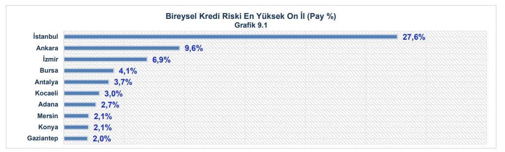 Bireysel kredi kullanımının en riskli olduğu iller sırasıyla; İstanbul, Ankara, İzmir, Bursa, Antalya, Adana, Kocaeli, Konya, Mersin ve Gaziantep oldu.