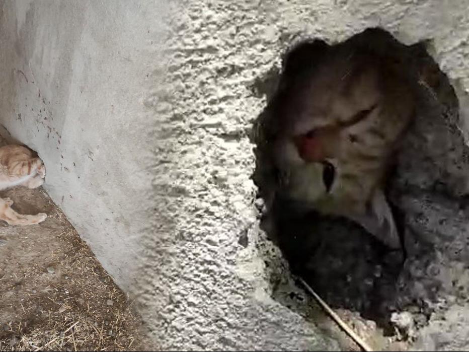 Duvardaki delikte sıkışan kedi kurtarıldı