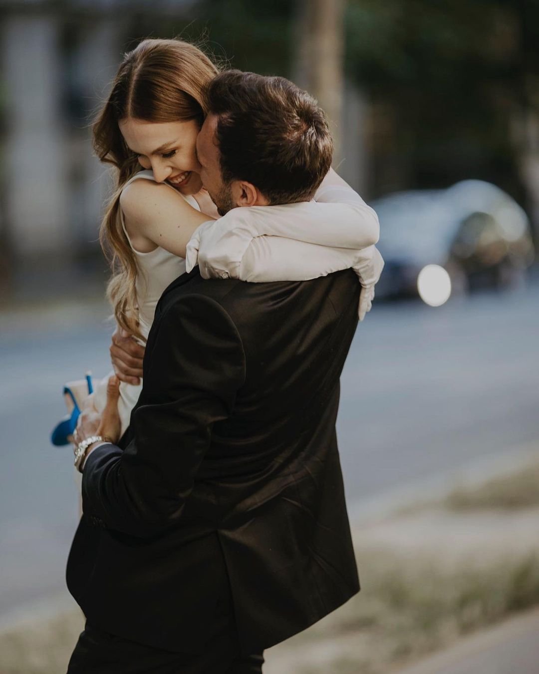 Özaslan nikâh günü, beyaz saten sade ve mini bir elbise, altına mavi stiletto ayakkabı tercih ederken, Mutaf da bu mutlu gününde siyah smokin takım tercih etti.