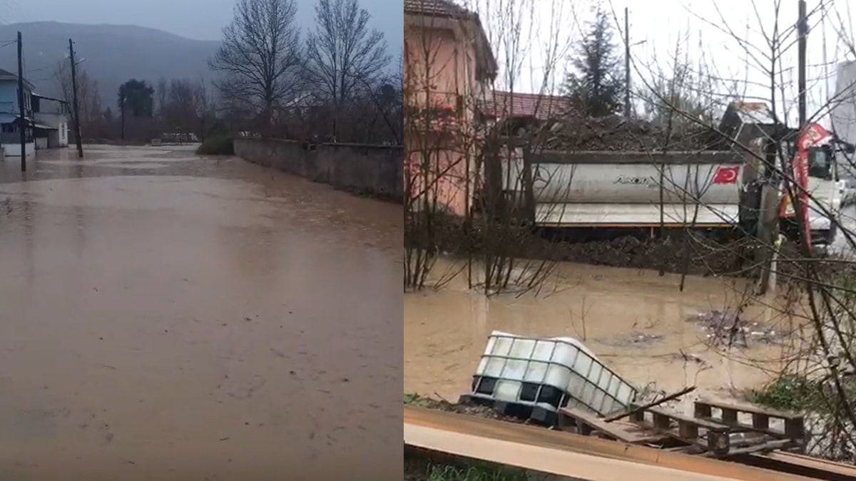 Düzce'de sabah saatlerinden bu yana etkili olan sağanak yağış nedeniyle Gölyaka ilçesindeki çeşitli mahallelerde derelerin taşması sonucu evleri su bastı.