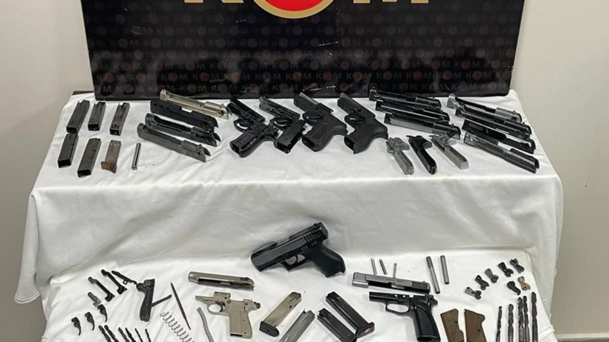 Hakan S. ve Murat B.'ye ait işyerine düzenlenen operasyonda, 8 silah gövdesi, 13 silah üst kapağı, 3 kabza sırtlığı, 4 şarjör, 7 silah horozu, 3 tetik, 4 gövdeye tespit pimi, 5 silah yayı, 2 namlu yapmak üzere kullanılan boru parçası, kuru sıkı tabanca ve 11 silah yapımında kullanılan matkap ucu ele geçirildi.
