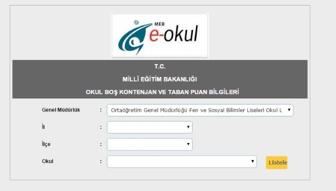 E okul nakil işlemleri için sorgulama.biz.tr sitesindeki e okul boş kontenjan sorgulama yazısında da belirtildiği gibi ilk olarak boş kontenjan sorgulaması yapılmalıdır. Nâkili işlemlerinde mevcut boşluklara nakil talebinde bulunabildiğinden kişilerin e okul yönetim bilgi sistemi üzerinden yapacağı nakil talebi öncesinde MEB tarafından kullanıma sunulan boş kontenjan sorgulaması yapılmalıdır. Sorgulama işlemlerinde kişiler aşağıda resimde yer alan sayfayı takip etmelidir.