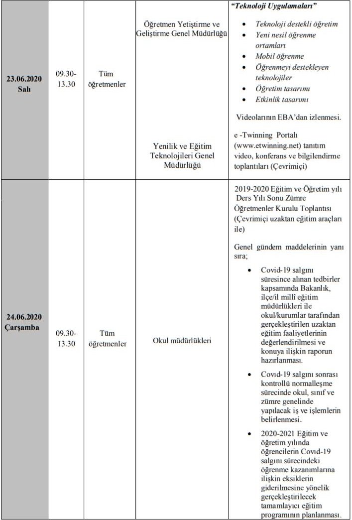 22 Haziran pazartesi günü online seminerler EBA üzerinden merkezi olarak başlıyor. Daha sonra her okul Zoom, Teams vb programlar üzerinden kendi toplantılarını gerçekleştirmeye devam edecek.
