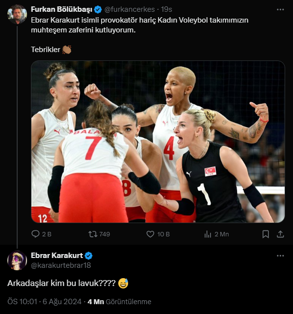 Trollerin sık sık hedef aldığı milli voleybolcu Ebrar Karakurt ise söz konusu paylaşıma "Arkadaşlar kim bu lavuk?" sözleriyle yanıt verdi.