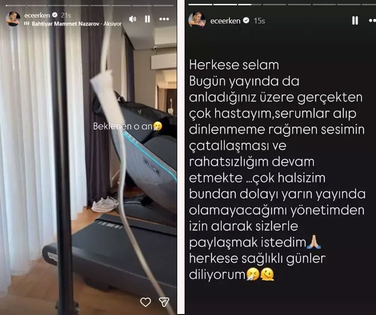 Ece Erken sosyal medya hesabından yaptığı paylaşımda, ''Serumlar almama rağmen rahatsızlığım devam ediyor. Bundan dolayı yayında olamayacağım.'' ifadelerini kullandı. Sunucu, sevenlerini bilgilendirerek sağlık durumu hakkında açıklama yaptı.