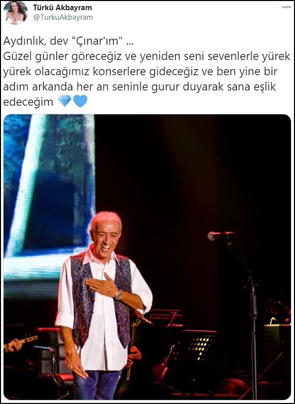 Sanatçı Edip Akbayram'ın kızı Türkü Akbayram, Twitter hesabından babasıyla ilgili, "Aydınlık, dev çınarım... Güzel günler göreceğiz ve yeniden seni sevenlerle yürek yürek olacağımız konserlere gideceğiz ve ben yine bir adım arkanda her an seninle gurur duyarak sana eşlik edeceğim" mesajını paylaştı.