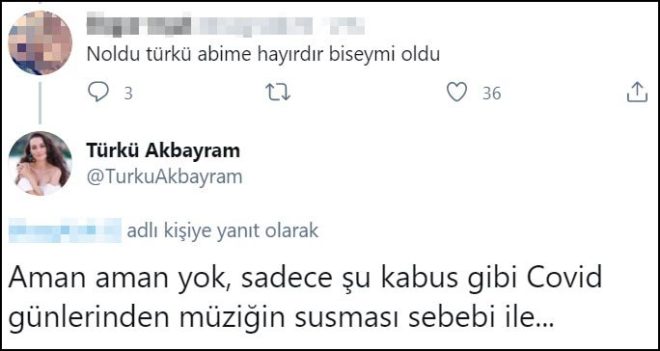 Türkü Akbayram, bir kullanıcının, "Ağabeyime bir şey mi oldu?" sorusuna "Aman aman yok, sadece kabus gibi Covid günlerinden dolayı müziğinin susması sebebi ile" yanıtı verdi. Bu cevapla Edip Akbayram'ın sevenleri de rahat bir nefes aldı.