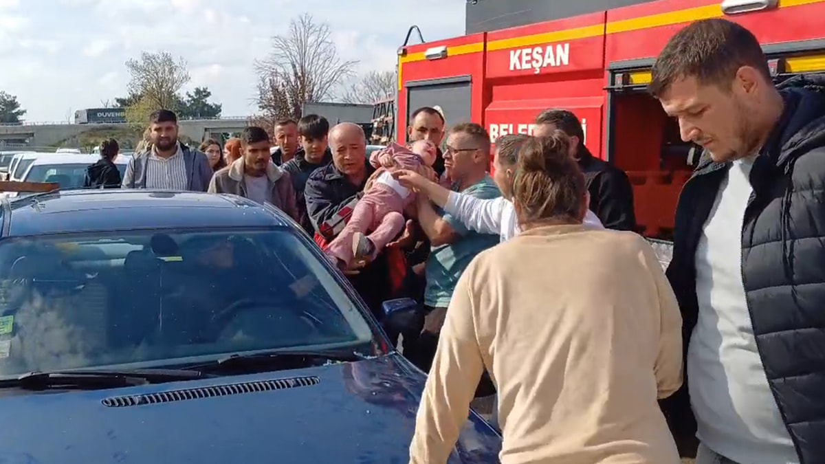 Edirne'nin Keşan ilçesinde, anne- babasının otomobilde unuttuğu anahtarla oynadığı sırada kapılarını kilitlediği araçta mahsur kalan 2 yaşındaki kız çocuğu, itfaiye ekiplerinin camı kırmasıyla kurtarıldı. O anlar, cep telefonu kamerasıyla kaydedildi.