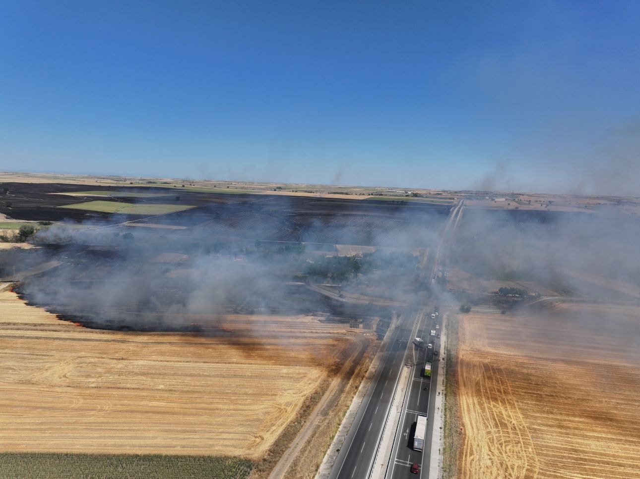 Edirne-Havsa kara yolunun Oğulpaşa mevkisinde, buğday ve ayçiçeği ekili tarlaların bulunduğu alanda anız yangını çıktı. Yangın, rüzgarın etkisiyle kısa sürede büyürken, yükselen yoğun duman gökyüzünü kapladı ve görüş mesafesini düşürdü.