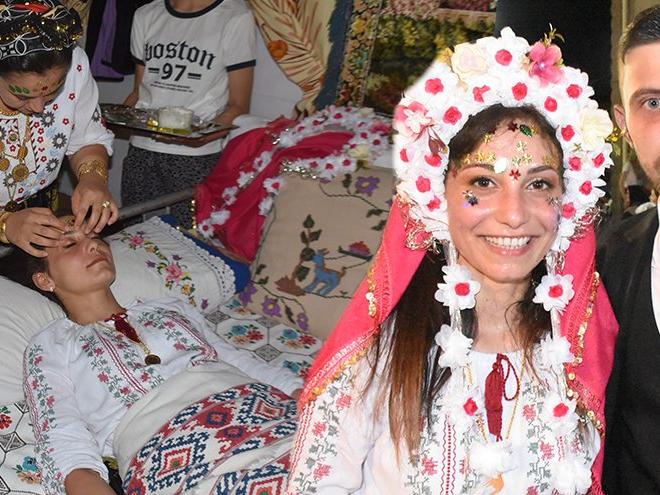 Gelinin arkadaşlarının süslenmesinin ardından köydeki kadınların söylediği ağıtlar ve türküler ile yatağa yatırılan gelinin yüzünün tamamını pullarla süsleyip geceye hazırladılar. Süslemenin ardından yataktan kaldırılan geline, damadın 80 yıl önce babaannesinden kalan el yapımı kıyafeti giydirildi.