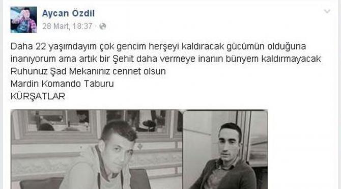 Öte yandan Şehit Uzman Çavuş Aycan Özdil'in geçen hafta operasyonlarda şehit olan arkadaşları için sosyal paylaşım sitesinde, "Daha 22 yaşımdayım çok gencim her şeyi kaldıracak gücümün olduğuna inanıyorum, ama artık bir şehit daha vermeye inanın bünyem kaldırmayacak. Ruhunuz Şad Mekanınız cennet olsun, Mardin Komando Taburu" paylaşımında bulunduğu görüldü.