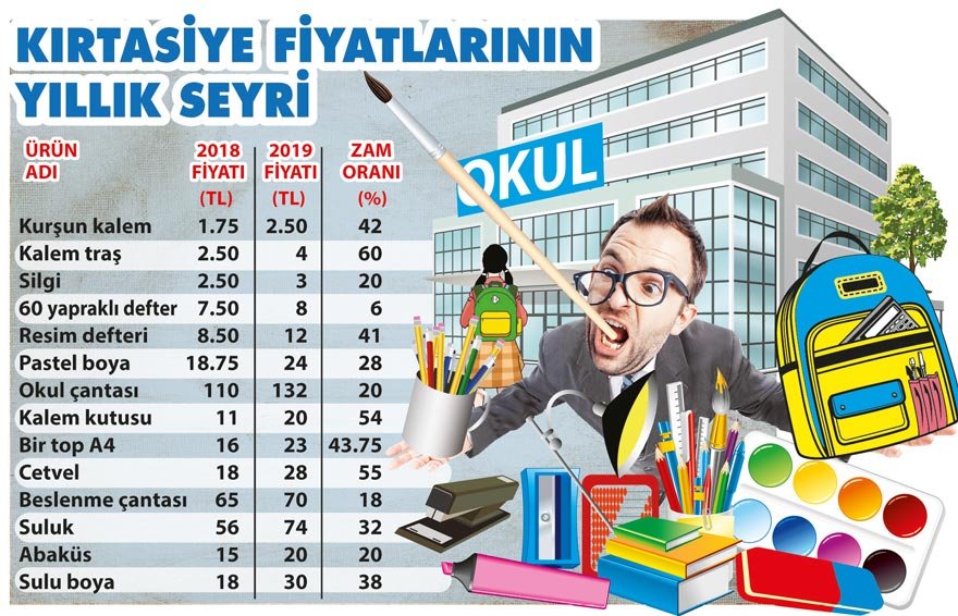 “Kırtasiye malzemelerinin her birinde ortalama yüzde 6 ile yüzde 60 oranında artış söz konusu. 2018’de 1.75 lira olan kurşun kalem yüzde 42 arttı ve 2.50 lira oldu. Öğrencilerin okul derslerine ek olarak kullandıkları yardımcı kaynaklarda da fahiş artışlar meydana geldi. Her bir ders için kullanılan yardımcı kaynak kitaplarının fiyatları geçen yıl 30-40 lira arası değişirken bu yılki öğretim döneminde öğrencilerin kullandıkları yardımcı ders kitaplarının fiyatları 50 ile 65 lira oldu.”