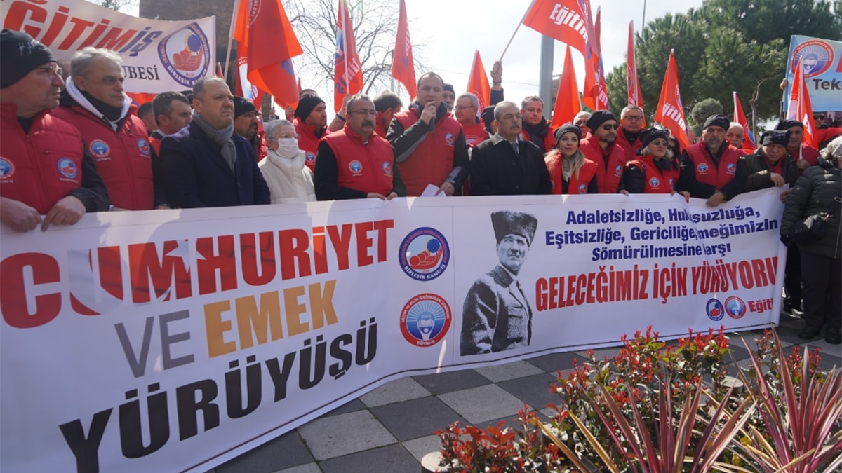 CHP milletvekilleri, Atatürkçü Düşünce Derneği, Çağdaş Yaşamı Destekleme Derneği, 29 Ekim Kadınları Derneği temsilcileri ile çok sayıda vatandaşın da destek verdiği yürüyüş öncesi basın açıklaması yapan Eğitim-İş Sendikası Genel Başkanı Kadem Özbay, şunları söyledi: