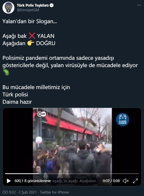"Polisimiz pandemi ortamında sadece yasa dışı göstericilerle değil, yalan virüsüyle de mücadele ediyor. Bu mücadele milletimiz için. Türk polisi daima hazır" mesajı ile paylaşılan videoda polisin, "İn aşağı, in aşağı, aşağıdan, aşağıdan. Toplu gitmek yok" diyerek gruptakileri uyarması yer aldı.