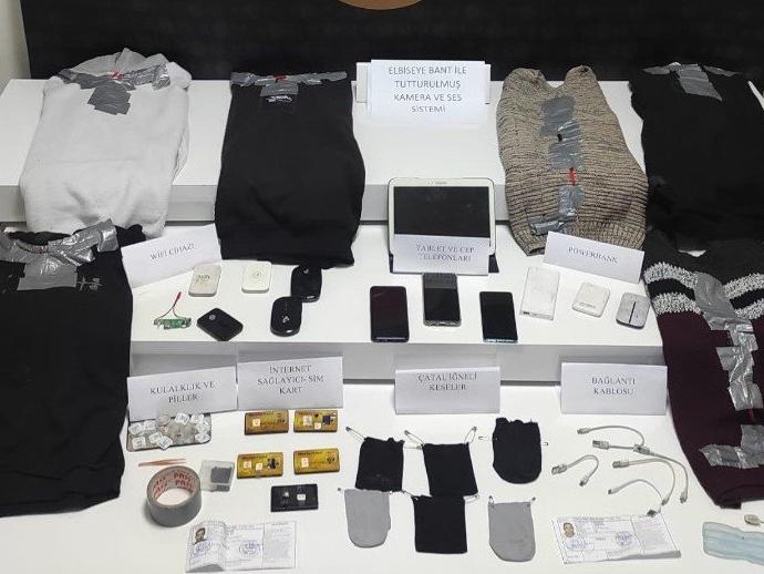 Yakalanan şüpheliler üzerinde yapılan aramalarda, 17 adet bağlantı kablosu, 14 adet pil, 15 adet kamera ve kamera aparatı, 5 adet kablosuz ağ, 6 adet kulaklık, 6 adet GPS cihazı, 7 adet kopya çekmek için kullanılan kumaş parçası, 6 adet düğme, cımbız gibi suçta kullanılan malzeme, 2 adet cep telefonu ve sim kartları olmak üzere toplam 78 adet cihaz ve malzeme ele geçirildi.