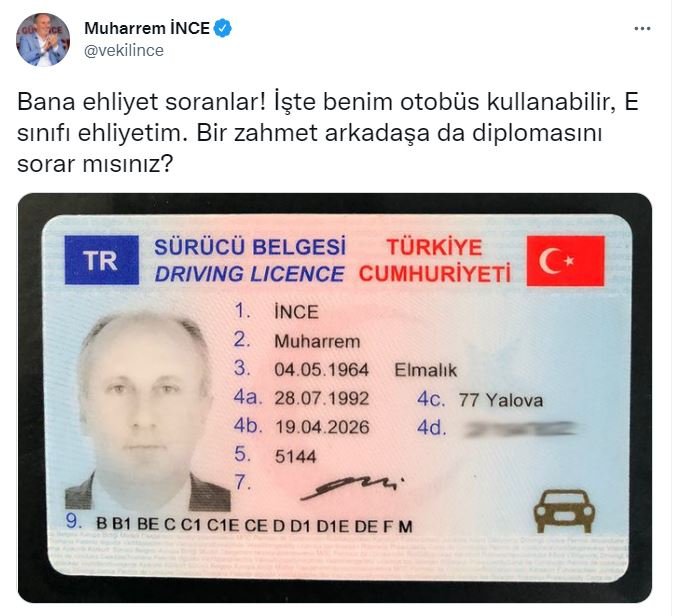 İnce, yaptığı açıklamada "Bana ehliyet soranlar! İşte benim otobüs kullanabilir, E sınıfı ehliyetim. Bir zahmet arkadaşa da diplomasını sorar mısınız?" dedi.