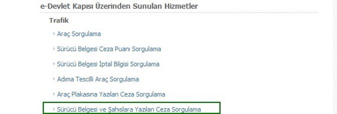 Resimde de görüldüğü üzere kişiler; araç sorgulamadan sürücü belgesi ceza puanına kadar Emniyet Genel Müdürlüğü tarafından sunulan hizmetler aracılığı ile durumunu takip edebilir. Bu ekranda özellikle trafik cezası sorgulama işlemlerini yapmak oldukça kolaydır. Trafik cezası sorgulama için tercih edilebilen ilk hizmet sürücü belgesi ve şahıslara yazılan ceza sorgulamadır. Bunun için aşağıdaki resimdeki hizmet seçilmelidir.