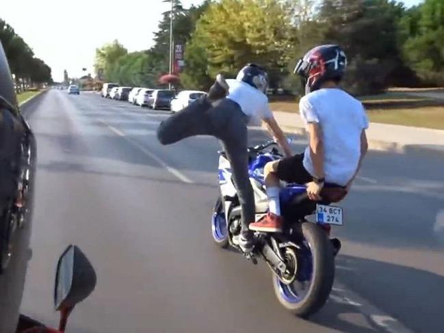 Bununla da yetinmeyen maganda, motosiklete yan oturarak bacak bacak üstünde kullandı. Hiç kimseyi bir an olsun umursamayan genç, tek tekerlek üstünde gitmesinin yanı sıra motosikletin üstünde çıkarak tek bacağıyla akrobasi yaptı. Motosikletin direksiyonuna da oturan maganda, trafikte yapılmaması gereken ne varsa yaptı. Korku dolu o anları hem kendi kask kamerasıyla hem de arkadaşlarının kamerasıyla kaydettirip bir de sosyal medyada yayınladı.