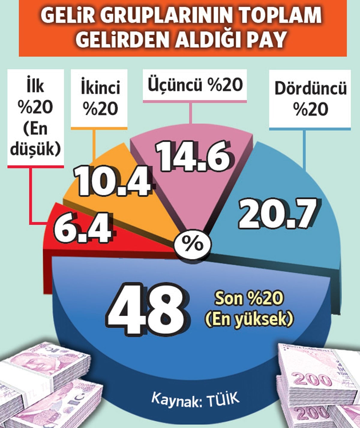 Türkiye İstatistik Kurumu’nun (TÜİK) “Gelir Dağılımı İstatistikleri, 2025” sonuçlarına göre, en yüksek gelire sahip yüzde 20’lik kesim toplam gelirin yüzde 48’ini aldı.