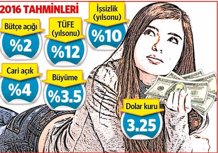 Ekonominin gidişatını gösteren parametreleri tahmin ederken, üç saydam kâğıt kullanırım. Birinci kâğıda, dünya ekonomisi için beklentilerimi çizerim. İkinci kâğıda ülke ekonomisinin, kendi haline bırakılsa nereye gideceğini resmederim. Üçüncü kâğıda ise, ülke ekonomisini yönetenlerin niyet ve reflekslerinin yönlerini işaretlerim. Bu üç kâğıdı üst üste koyarak, beyaz zemin üzerinde bıraktığı izdüşümü bulurum. Yukarıda yer alan tablo benim 2016 için öngördüğüm “en muhtemel” iyimser sonuçlardır.