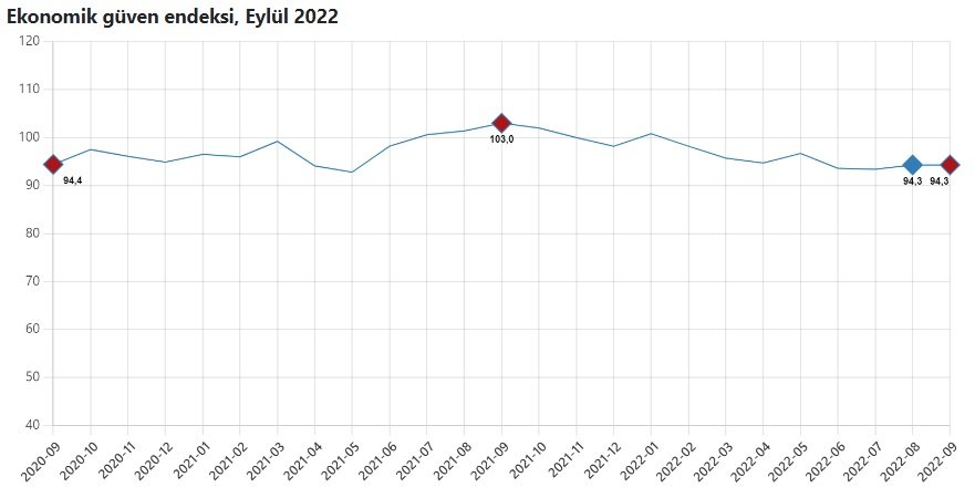 Buna göre, ekonomik güven endeksi eylül ayında aynı düzeyde kalarak 94,3 değerini aldı.
