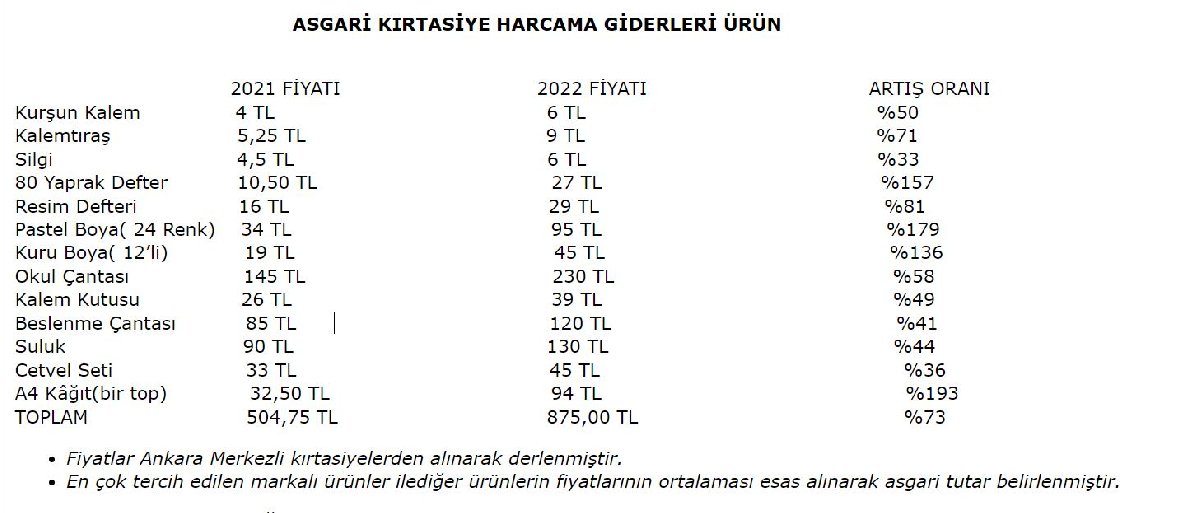 "Defter ve Pastel boya fiyatlarında geçtiğimiz yıla göre yüzde 150’nin üzerinde arttı. Bir tek kurşun kalemin fiyatı ise geçtiğimiz yıla göre yüzde 50 oranında artarak 6 TL’ye yükseldi. Bir asgari ücretlinin çocuğu için yapması gereken kırtasiye harcamalarının yanı sıra okul kıyafetleri ve servis ücretleri de eklenince, açlık sınırı altında ay sonunu getirmeye çalışan asgari ücretli için okul masrafı içinden çıkılamaz bir bütçe yüküne dönüşmektedir. Sadece bir çocuk için ödenmesi gereken minimum tutarın 875 TL’ye çıktığını düşündüğümüzde aile de birden fazla çocuk için bu masraf katlanarak artmaktadır. Ekonomik kriz sadece mutfağı değil asgari ücret ile geçinen milyonlarca çalışanın okul çağında ki çocuklarını da etkilemeye devam ediyor."