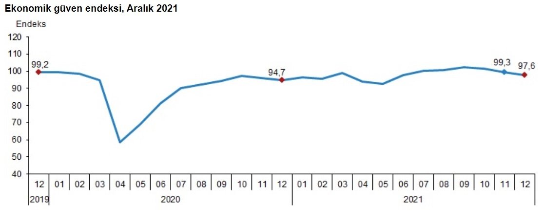 Tüketici güven endeksi bir önceki aya göre aralık ayında yüzde 3,1 oranında azalarak 68,9 değerini, reel kesim güven endeksi yüzde 1,7 oranında azalarak 110,1 değerini, hizmet sektörü güven endeksi yüzde 0,5 oranında azalarak 118,8 değerini, perakende ticaret sektörü güven endeksi yüzde 0,4 oranında azalarak 121,5 değerini ve inşaat sektörü güven endeksi yüzde 3,9 oranında azalarak 90,0 değerini aldı.