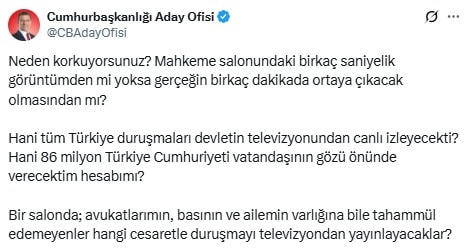 İmamoğlu, Cumhurbaşkanlığı Aday Ofisi’nin sosyal medya hesabından paylaşılan mesajında, duruşmanın kamuoyuna açık yapılmamasına tepki gösterdi.
