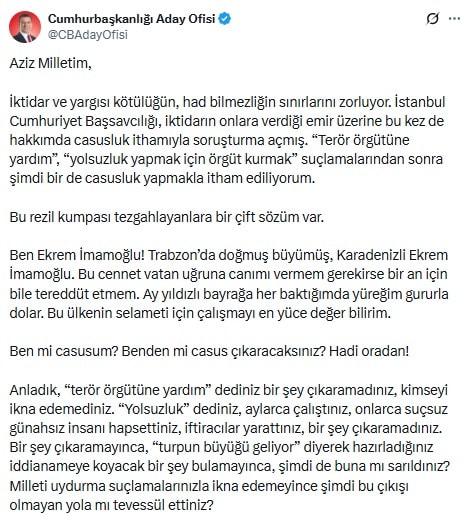 Ekrem İmamoğlu, İBB soruşturması kapsamında yürütülen Casusluk soruşturması hakkında Cumhurbaşkanlığı Aday Ofisi hesabından tepki gösterdi.
