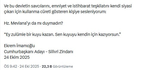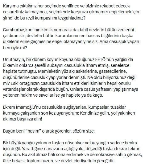 Bir büyük yangın yolunun taşları döşeniyor ve bu yangın sadece benim için değil. Yarattığınız canavarın açtığı yolu, döşediği taşları tekrar tekrar düşünün. Bu akıl almaz hâli sona erdirmek ve demokrasiye sahip çıkmak, ülke bekası, toplum huzuru ve devlet ciddiyetinin gereğidir.