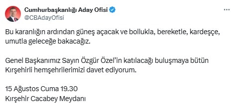 CHP'nin Cumhurbaşkanı adayı ve tutuklu İBB Başkanı Ekrem İmamoğlu Cumhurbaşkanlığı Aday Ofisi hesabından mitinge çağrı yaptı.