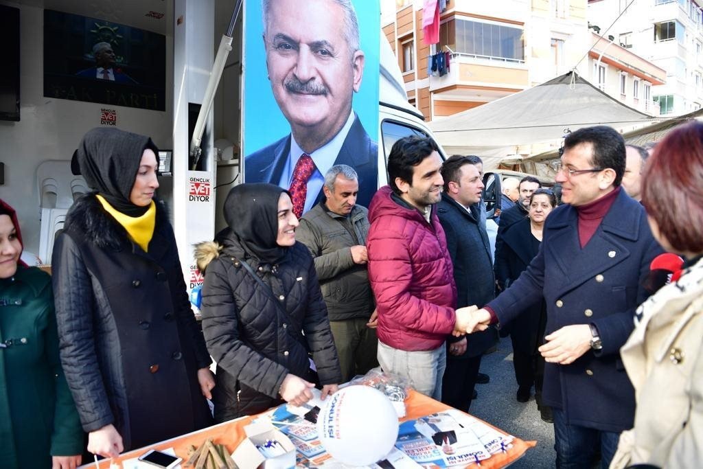 Kirazlıtepe'den Kısıklı Mahallesi'ndeki semt pazarına geçen İmamoğlu, burada Vatandaşların yoğun ilgisi ile karşılandı. Kendisine gelen fotoğraf çektirme isteklerini geri çevirmedi. İmamoğlu'nun kendisi gibi Trabzonlu olan Ali Kasap (70) ile yaptığı sohbette renkli anlar yaşandı. İmamoğlu, "16 senedir AK Parti'ye oy veriyorum. Geçmişteki kuyrukları, çöp dağlarını biliyorum" diyen Kasap'a, "30 sene geçmiş bunların üzerinden. Yanlışlar yapılmış olabilir. Şimdi ben rakibimden daha hızlı koşup, daha çok çalışmak için geliyorum" şeklinde yanıt verdi. Pazarın sonundaki AK Parti standına uğrayan İmamoğlu, başarılar dileyip, "Hilmi Bey'e (AK Parti Üsküdar Belediye Başkan adayı) selamlarımı iletin" dedi. DHA
