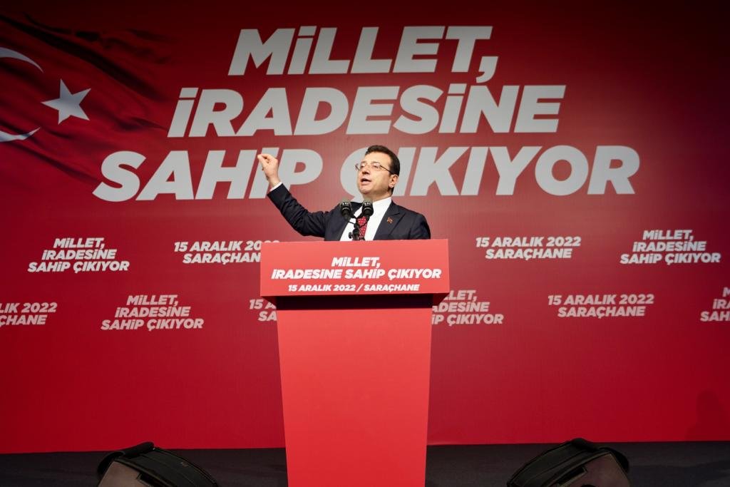 İlk konuşmayı İBB Başkanı Ekrem İmamoğlu yaptı. İmamoğlu desteğe gelen binlerce kişiyi “Demokrasiye inanan büyük Türk milleti, hepiniz hoş geldiniz sefalar getirdiniz. Burası Saraçhane, burası sizin eviniz. Burası milletin evi. Burada siz ne derseniz o olur” sözleri ile karşıladı. Coşkulu kalabalığa “Ama önce bana şu sorunun cevabını bir verin” diye seslenen İmamoğlu şunları söyledi:
