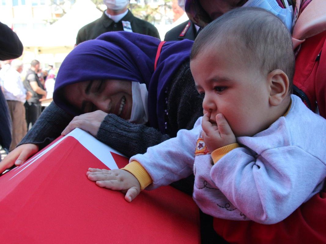Minik Melih'in, babasının tabutuna dokunması, yürekleri dağladı. Fatma Yiğit ise oğlunun tabutuna sarılarak gözyaşı döktü. Şehit Piyade Uzman Çavuş Muammer Yiğit, ilçe şehitliğinde dualar eşliğinde toprağa verildi.