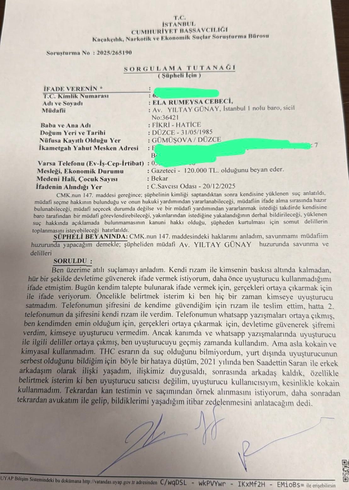 Cebeci, 20 Aralık 2025 tarihinde kendi rızasıyla ek ifade vermek için savcılığa başvurdu.