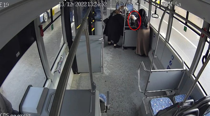 Kadın yolcunun sağlık durumunun iyi olduğu belirtilirken, o anlar otobüsün güvenlik kamerasına yansıdı. (DHA)