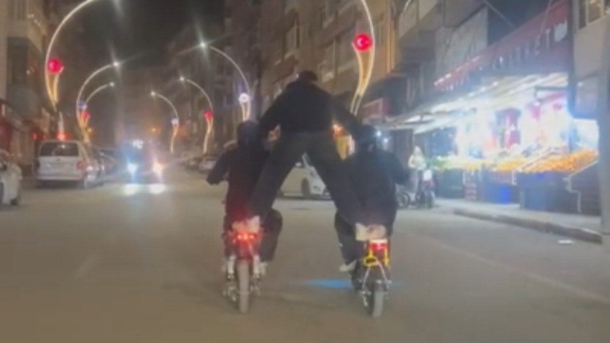 İki elektrikli bisiklete ayaklarını uzatan kişi sürücülere tutunup caddede ilerledi. Tehlikeli yolculuk caddeden geçen bir sürücü tarafından görüntülendi.
