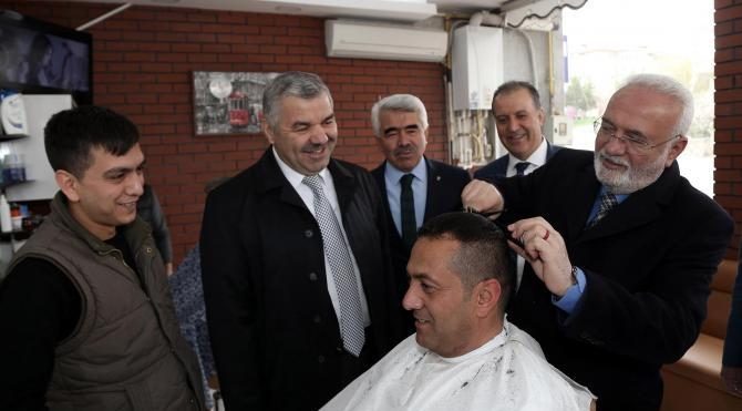 EKONOMİ eski Bakanı ve AK Parti Grup Başkanvekili Mustafa Elitaş, 16 Nisan referandum çalışmaları kapsamında ziyaret ettiği bir berber dükkanında, makası eline alarak, bir müşteriyi tıraş etti.
