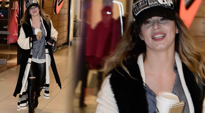 Deri taytı, renkli uzun hırkası, deri kısa parmak eldivenleri ve spor şapkasıyla dikkat çeken Eliz Sakuçoğlu, alışverişe kısa bir mola verip Starbucks’tan kahve alarak mağazaları dolaşmaya devam etti.